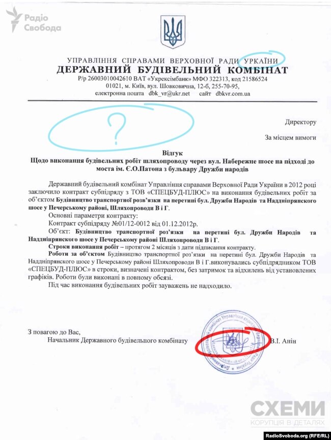 Однак, у документі не вказана дата складання відгуку та стоїть підпис директора, який звільнився ще 4 роки тому. У «шапці» також неправильно написали слово «Україна». Державний будівельний комбінат Верховної Ради офіційно підтвердив «Схемам», що не надавав такого відгуку. А про те, що компанія «Спецбуд-Плюс» виконувала якісь роботи на Набережному шосе на комбінаті відповіли, що вперше чують.