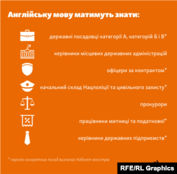 Вимоги до рівня англійської для посадовців пропонується узгодити із загальноєвропейськими стандартами CERF, для військових – зі стандартами НАТО за договором STANAG 6001.