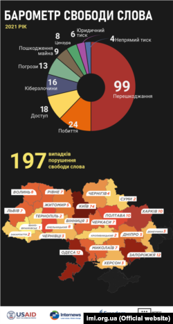 Експерти Інституту масової інформації (ІМІ) повідомляють, що найпоширенішим засобом обмежити свободу слова залишається фізична агресія щодо журналістів – у 2021 році, як і у 2020-му, на неї припало 74% усіх зафіксованих порушень.
