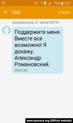 Ці смс розіслані через інтернет від абонента «FAR» (абревіатура, яка використовувалася кандидатом у громадсько-політичній діяльності – «Фонд Александра Романовського»), що не дає можливості ідентифікувати авторів, йдеться у повідомленні на сайті ОПОРИ.