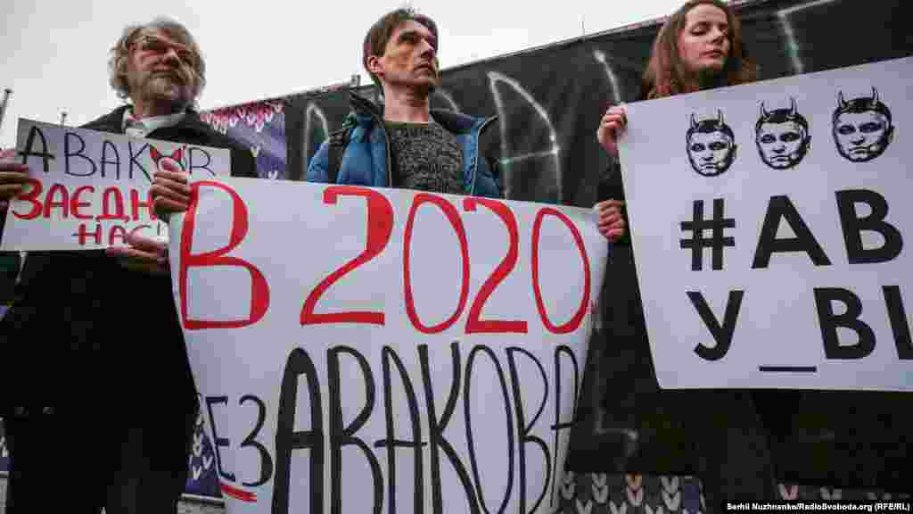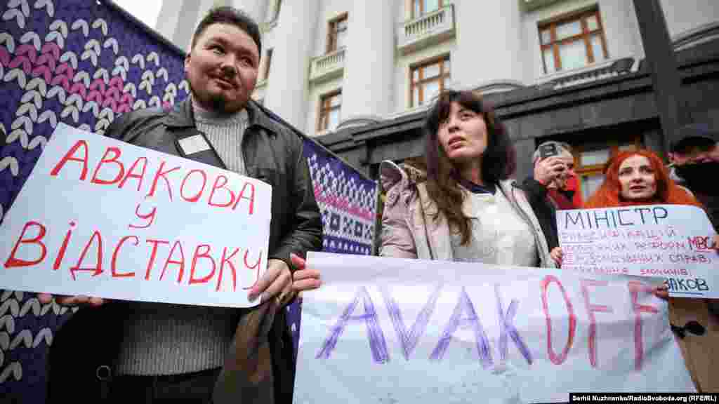 Декілька десятків активістів зібралися під Офісом президента з плакатами «Аваков чорт», «Тимчасовий міністр – час вийшов», «Авакова у відставку».