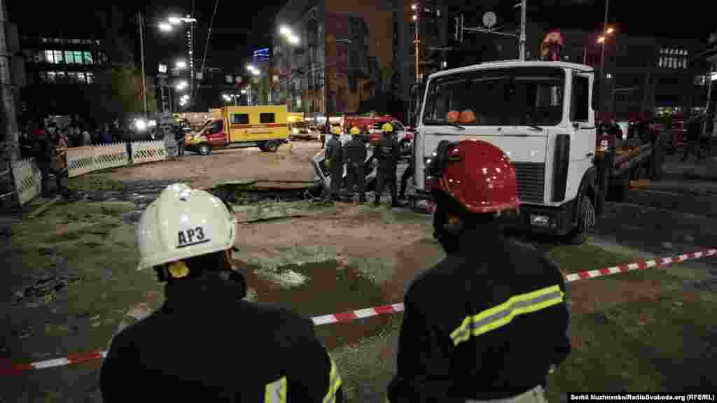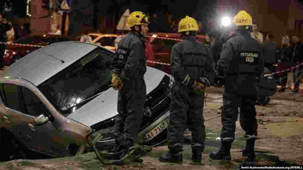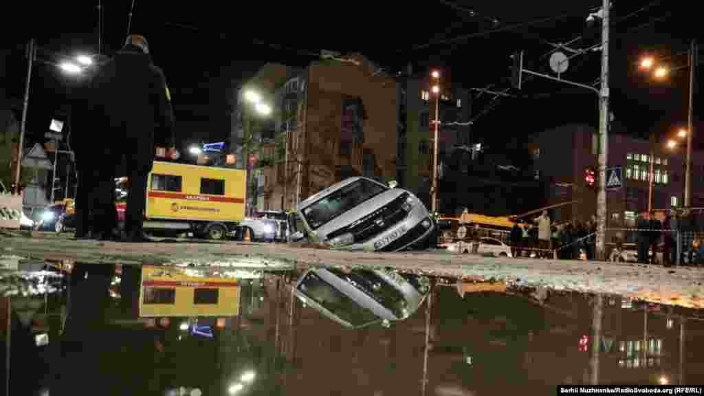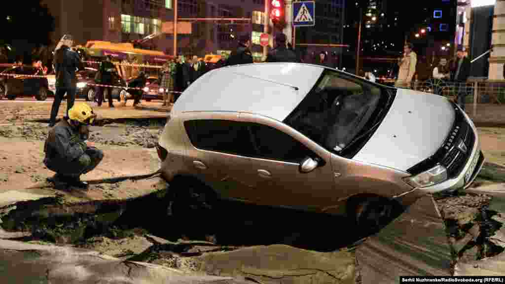 Автомобіль провалився під землю через аварію тепломережі на вулиці Еспланадній в центрі Києва.