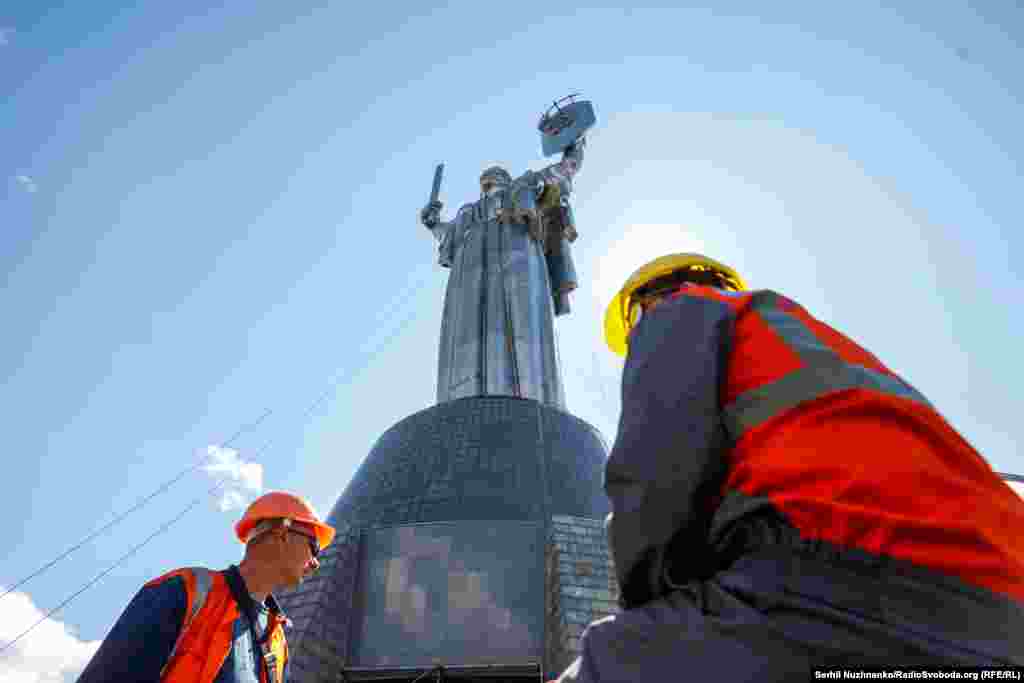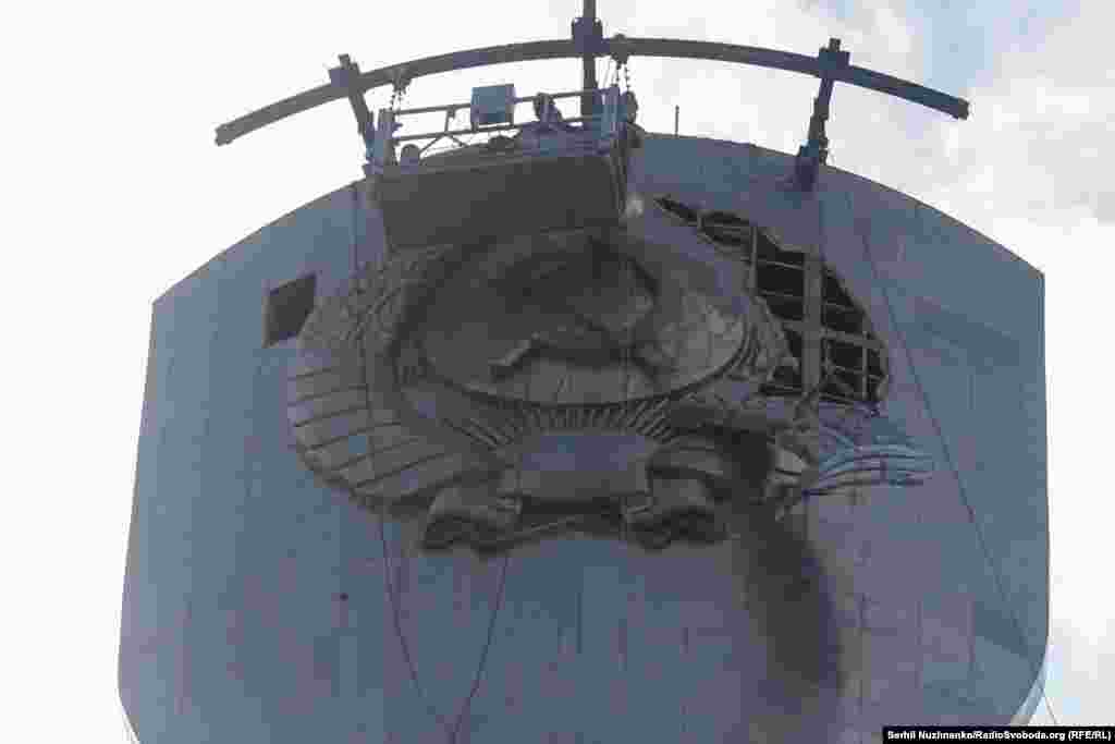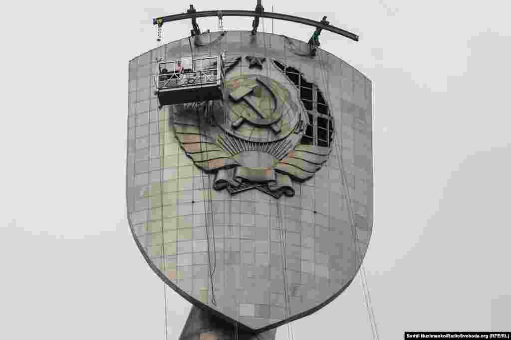 Монумент «Батьківщина-мати» розташований на території Національного музею історії України у Другій світовій війні. Він був споруджений у 1981 році і вважається найвищою скульптурою у Європі. Вага елементу герба, який демонтували в перший день – 120 кілограмів. Як розпочався демонтаж емблеми – дивіться у репортажі.