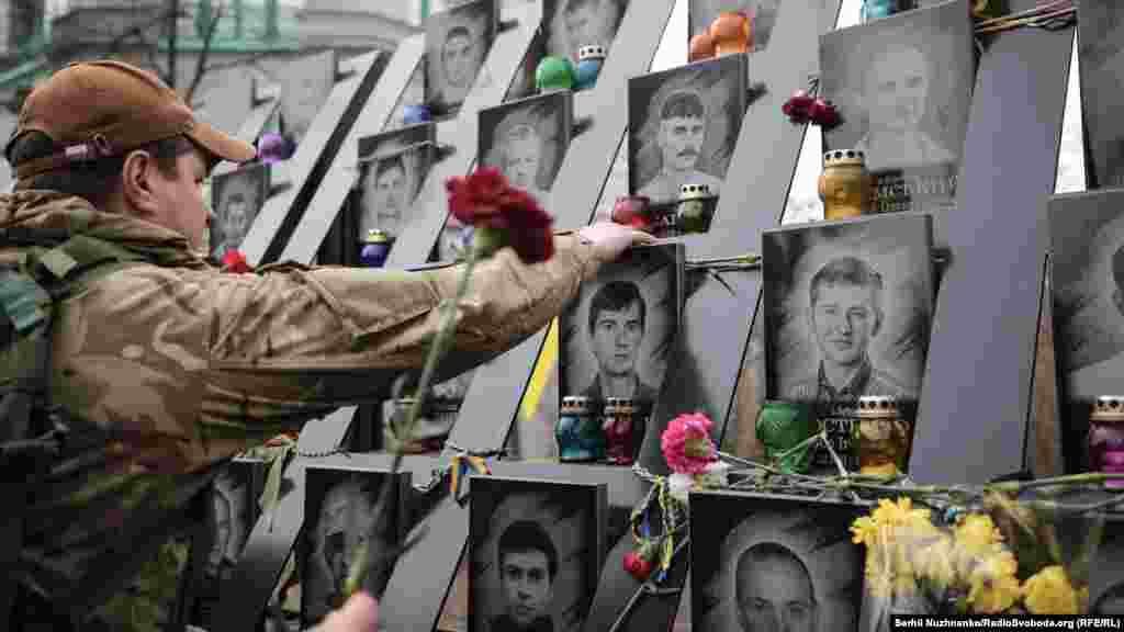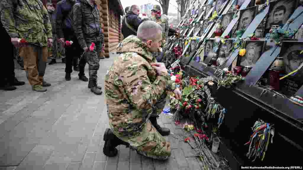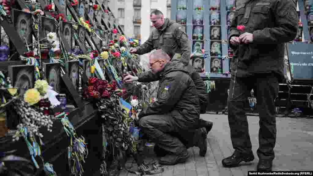 Хвилиною мовчання вшанували пам'ять загиблих. Військовослужбовці батальйону Кульчицького поклали квіти до меморіалу Небесної Сотні в Києві.