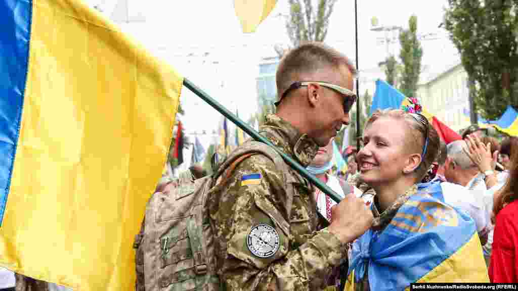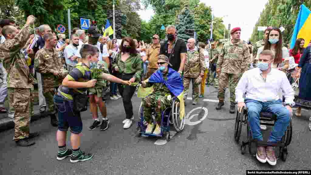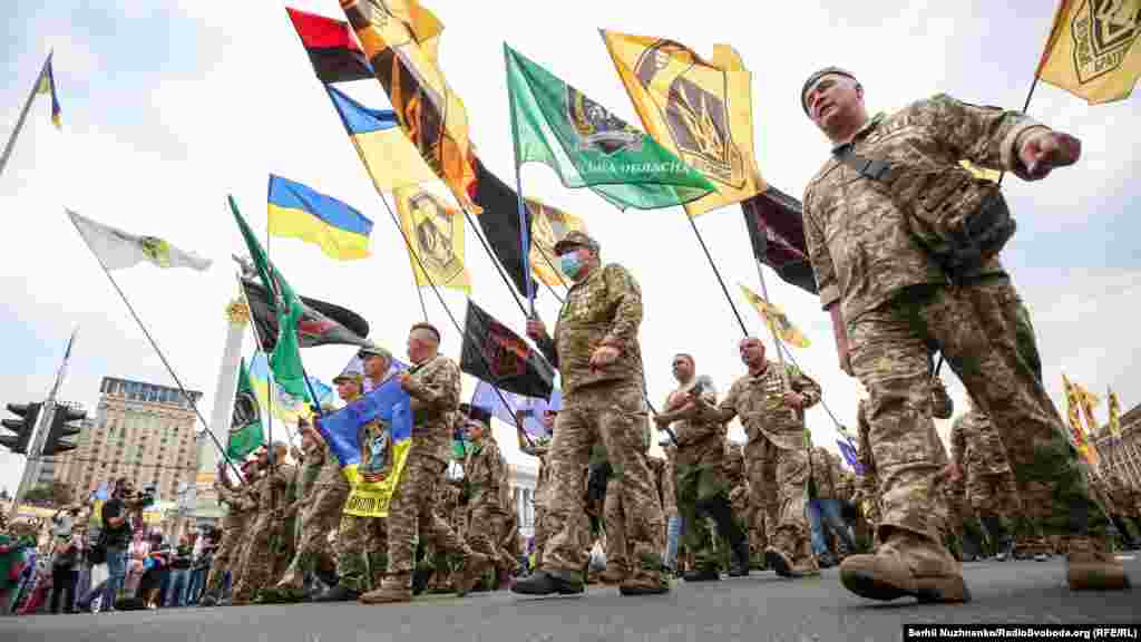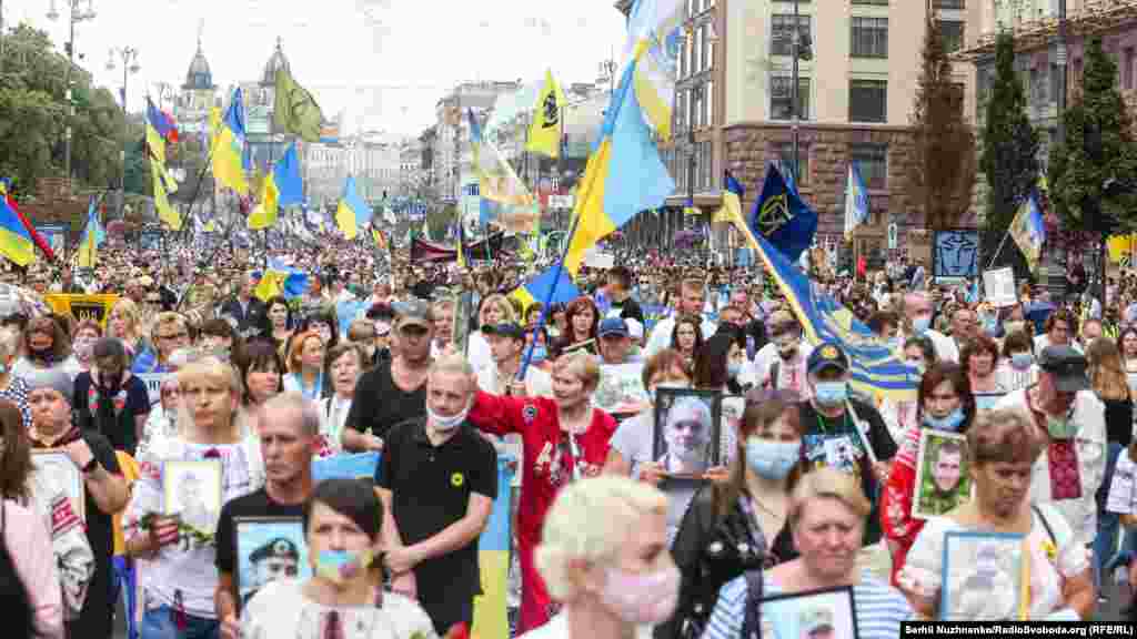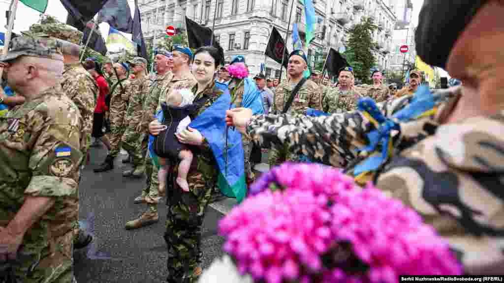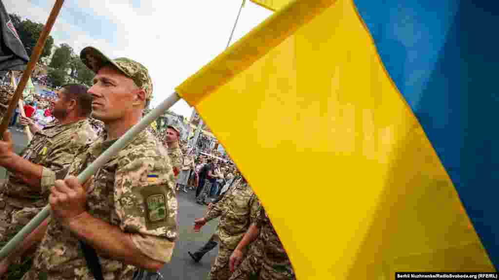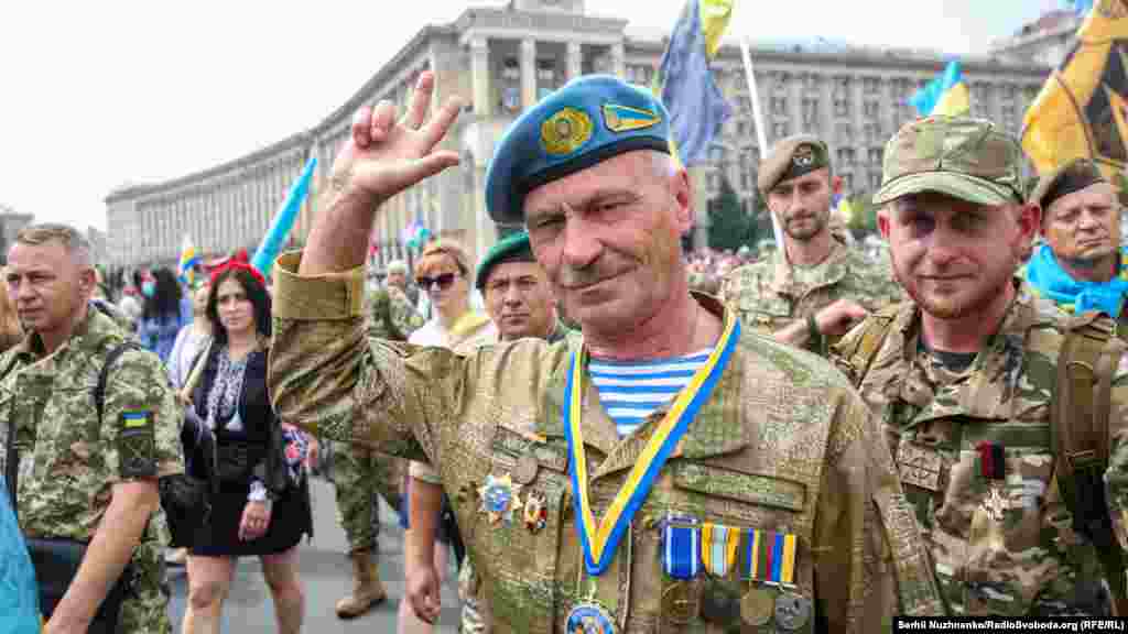 Тим часом у парку ім.Шевченка стартували дві багатотисячні акції – «Марш захисників України» та «Хода ветеранів». Вулицями Києва пройшли учасники війни на Донбасі, родичі тих, хто віддав життя за Україну, медики, волонтери та деякі політики.