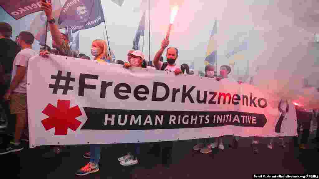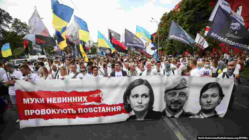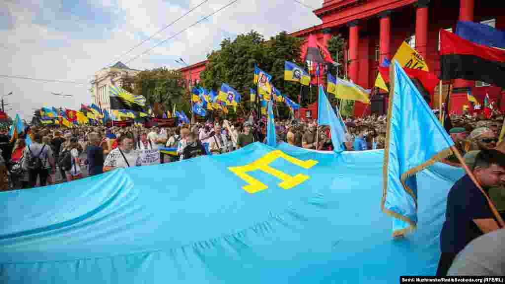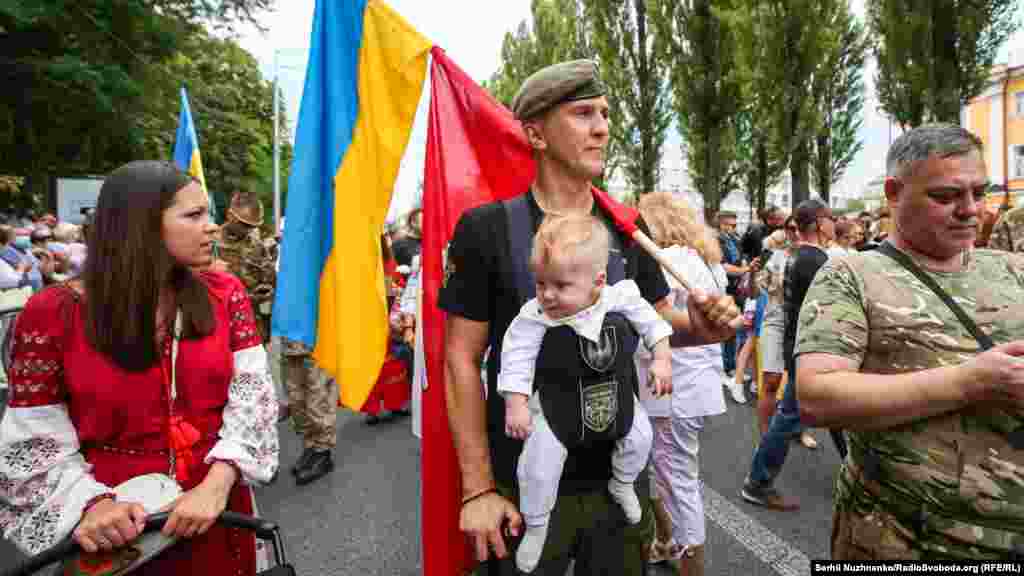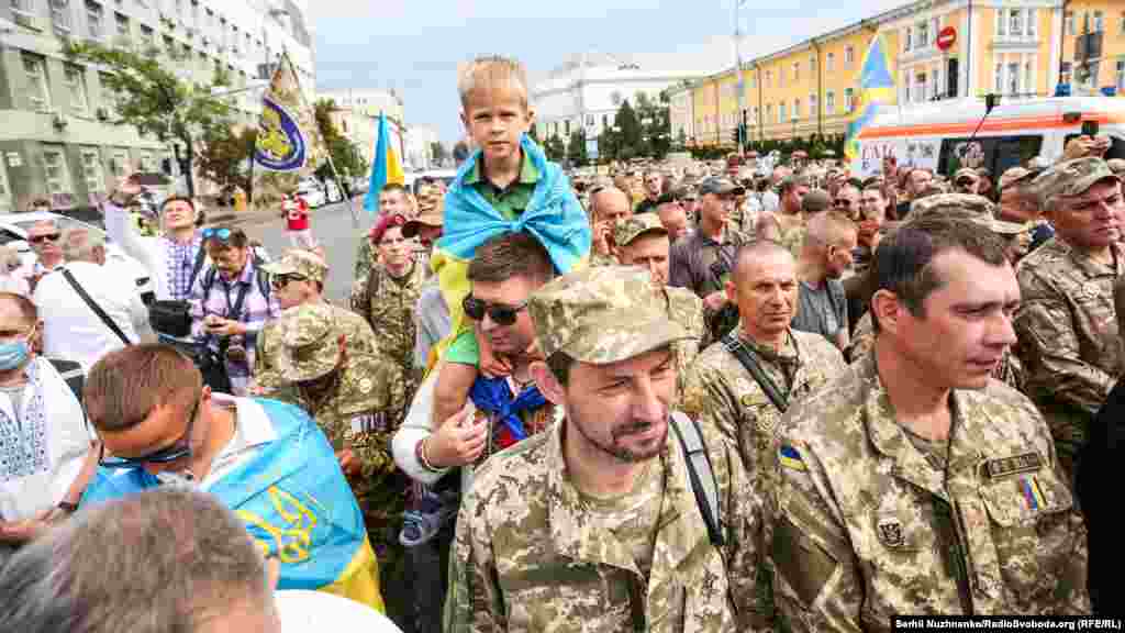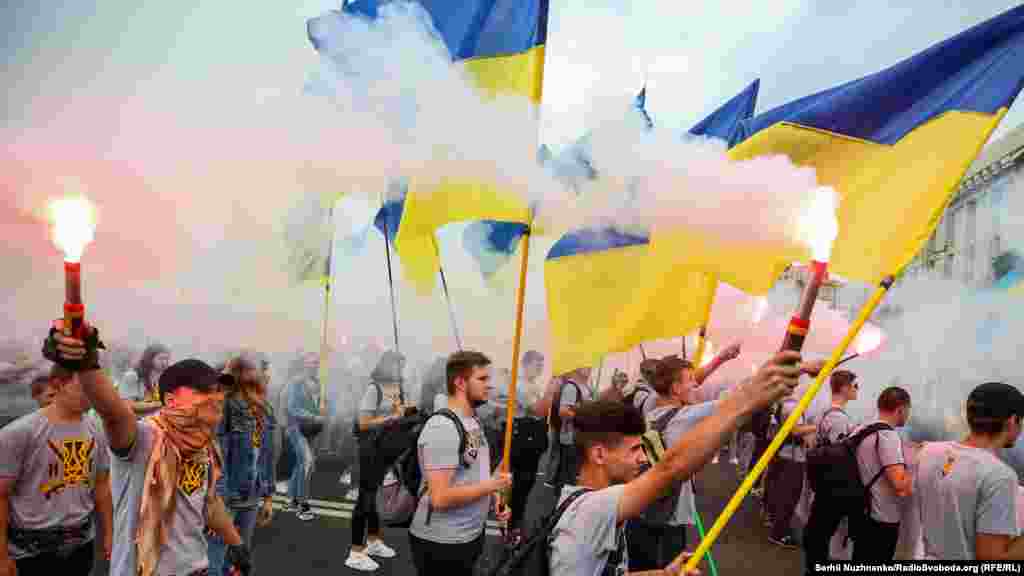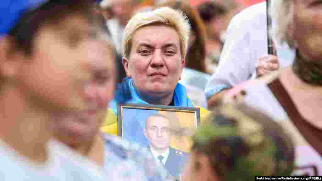 Тим часом у парку ім.Шевченка стартували дві багатотисячні акції – «Марш захисників України» та «Хода ветеранів». Вулицями Києва пройшли учасники війни на Донбасі, родичі тих, хто віддав життя за Україну, медики, волонтери та деякі політики.