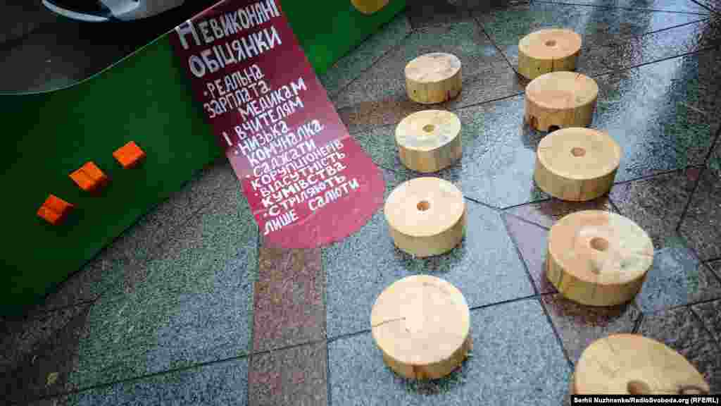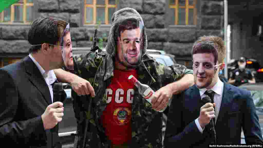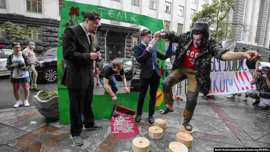 Учасники акції показали театральне дійство під назвою «Урядовий квартал» за участю «Януковича», «Зеленського» і «Пореченкова».