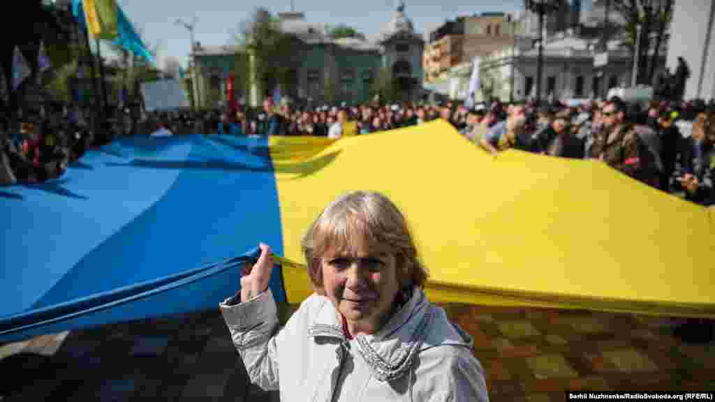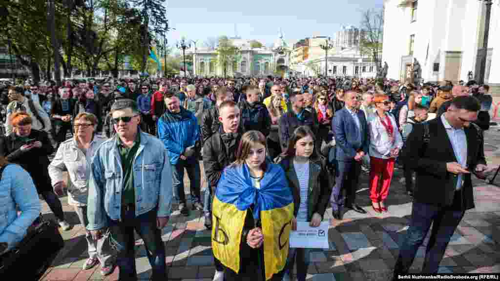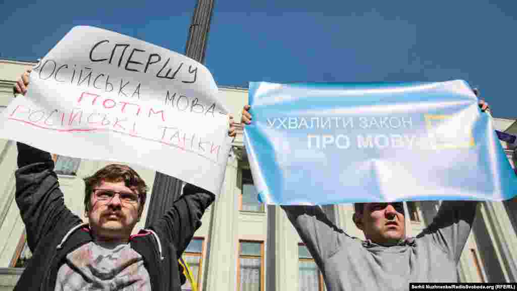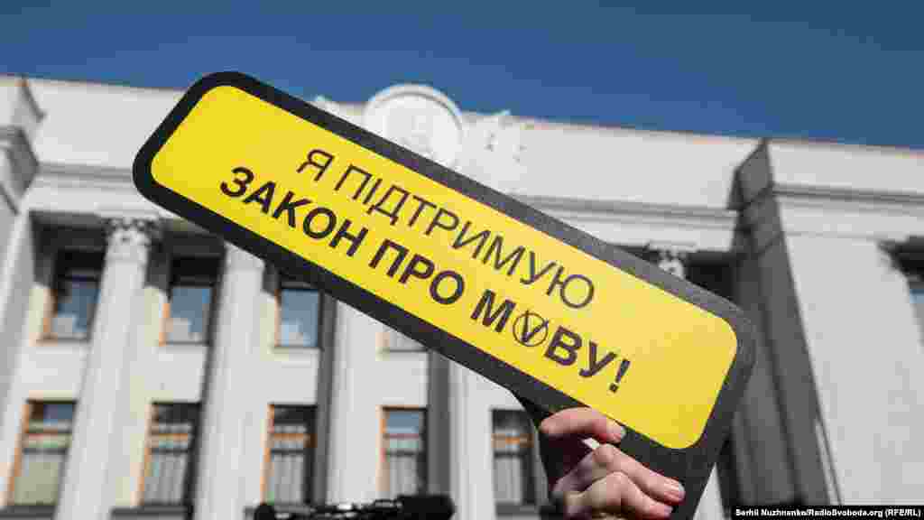 Близько тисячі людей зібралося під стінами українського парламенту, де проходила акція на підтримку закону про державну мову. Учасники тримали в руках плакати із закликами говорити українською і підтримати мовний закон.