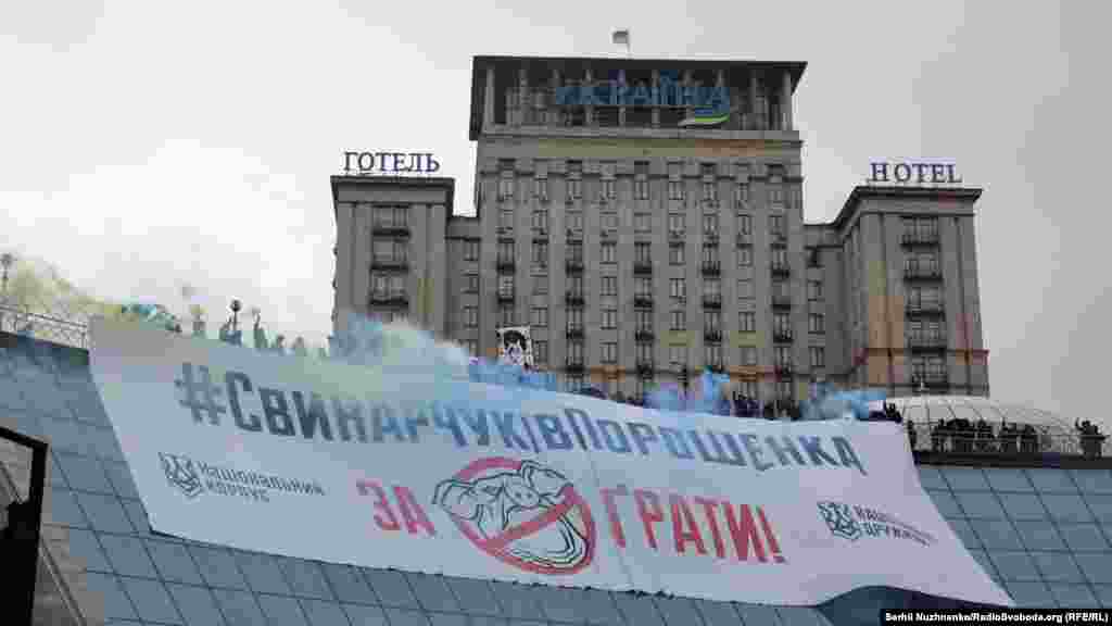 У центрі Києва, 16 березня, близько тисячі людей, здебільшого члени праворадикальної політичної партії «Національний корпус» та організації «Національні дружини», провели акцію з вимогою покарати винних в корупції в оборонці. Свою акцію вони завершили біля Адміністрації президента жбурлянням іграшкових свиней у бік АП. Акція пройшла мирно. Тиждень тому, 9 березня, представники праворадикальної партії «Національний корпус» і її напіввоєнізованого крила «Національні дружини» влаштували акції з вимогами взяти під варту фігурантів звинувачень проекту «Бігус.інфо» в розкраданні в оборонній промисловості Олега Гладковського, якого називають наближеним до президента Петра Порошенка, і його сина Ігоря, а також арештувати їхні рахунки. Акції відбулися спершу в центрі Києва, потім біля будівлі Адміністрації президента в Києві. Пізніше цього ж дня у Черкасах після виступу мітингу Петра Порошенка представники «Національного корпусу» намагались заблокувати його кортеж. Почалася бійка. Активісти спробували прорватись на сцену, застосовуючи піротехніку, поліція застосувала силу.