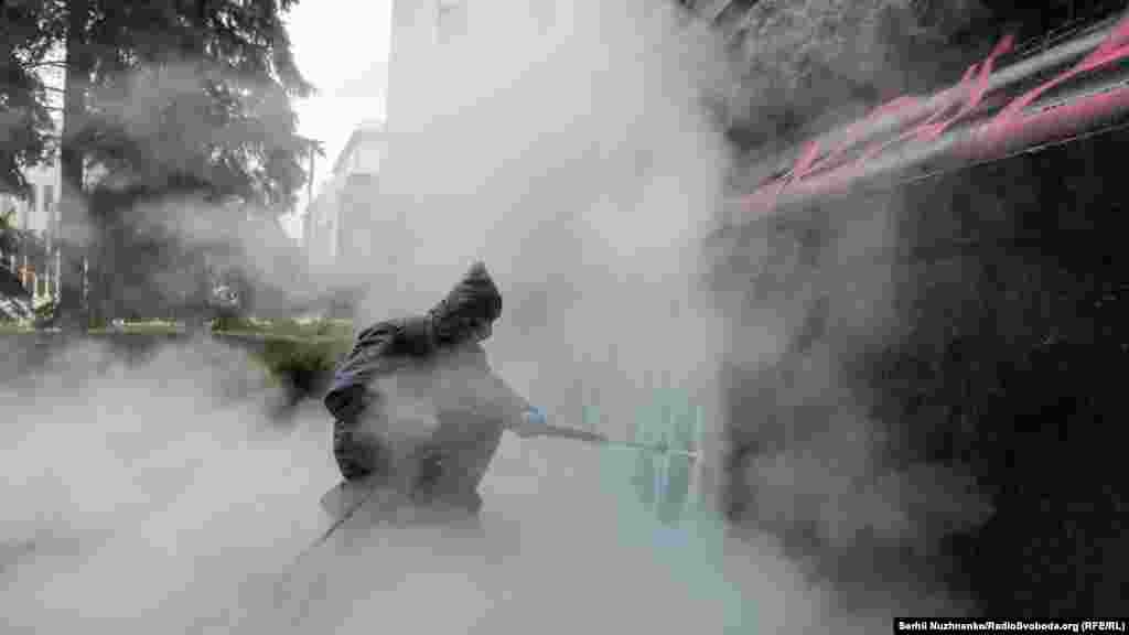 У понеділок, 22 березня, фахівці розпочали очистку гранітної частини будівлі від фарби