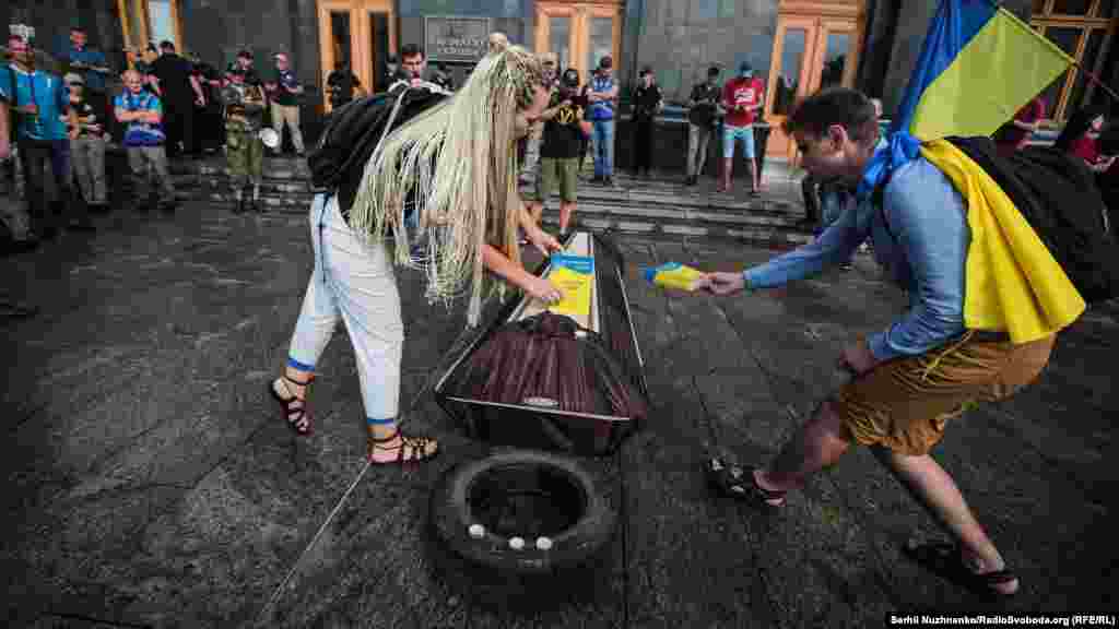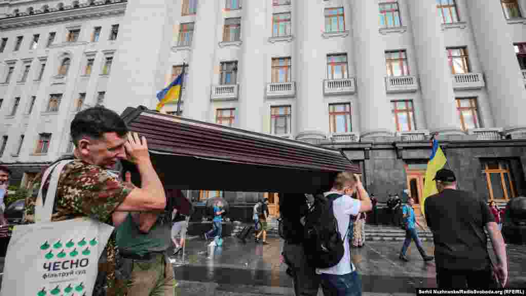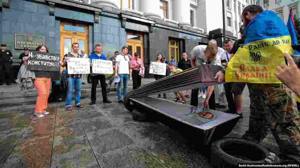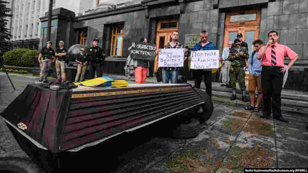 Біля будівлі офісу президента пройшла акція «Захисти Конституцію #CтопРеванш». Активісти напередодні дня Конституції вимагали звільнити голову офісу президента Андрія Богдана, речницю президента Юлію Мендель та притягнути до відповідальності Андрія Портнова. Учасники акції принесли на Банкову труну як символ «поховання Конституції».