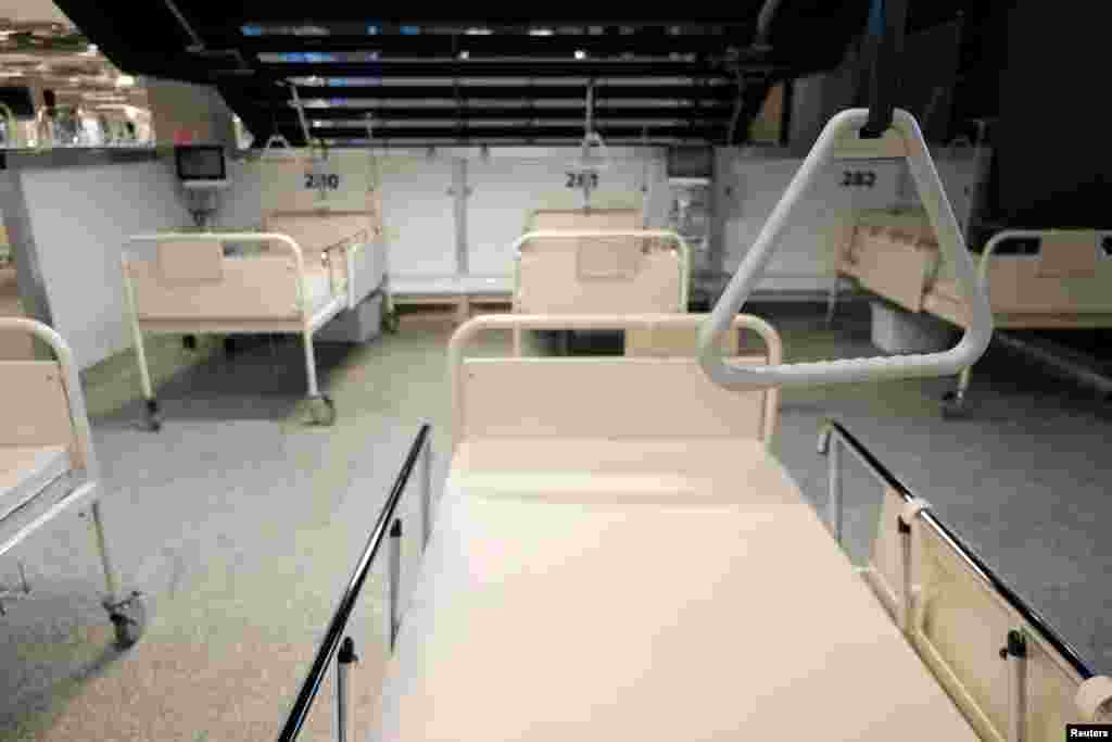 Медичні спеціалісти перевозять пацієнта в Національний стадіон, де відкрили спеціальну польову лікарню для людей, інфікованих коронавірусною хворобою
