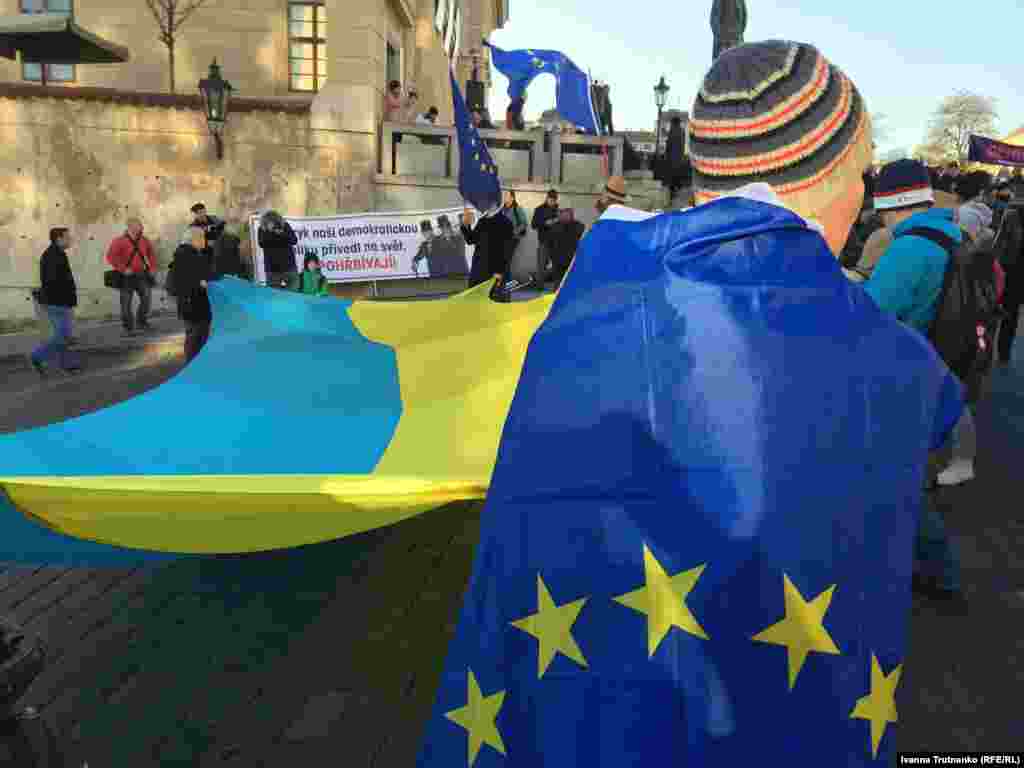 День Оксамитової революції у Празі відзначили з прапором України та написом на банері «Око за око, крім [кримінал] за Крим» – фотогалерея