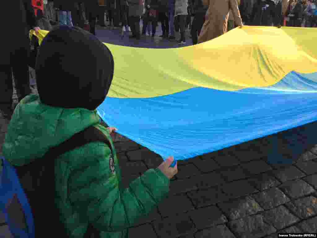 Напис на банері: «Око за око, крім [кримінал] за Крим. Обережно, хоче бути й нашим татом!»