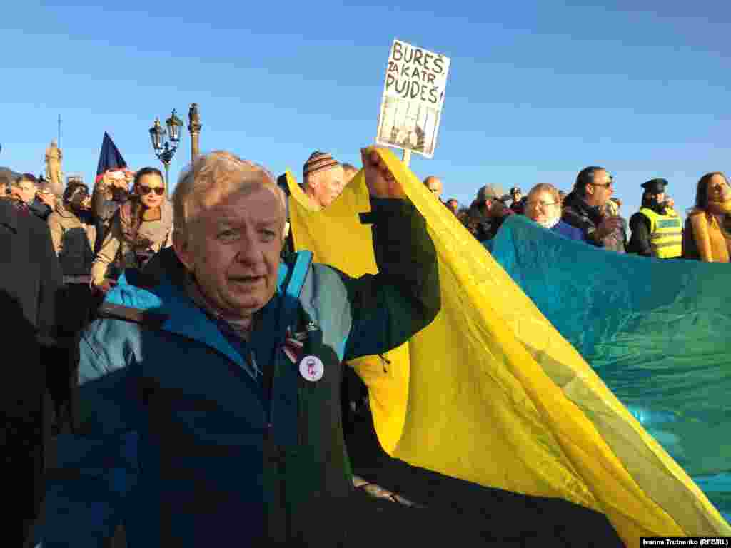 «Я тримаю прапор України, тому що, на мою думку, Україна є частиною Європи так само, як і ми. І те, що її окупують росіяни – це жахливо. Я хочу підтримати Україну. Якщо Росія змогла окупувати Україну, то ми наступні в черзі. Путін повторює історію. Я дуже добре пам’ятаю 1968 рік. Росіяни своєю присутністю пригнічували наші життя. Не можна допустити щоб усе повторилося», – учасниця акції