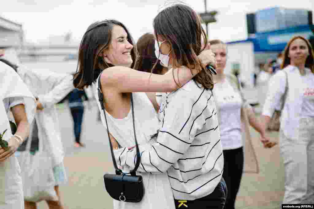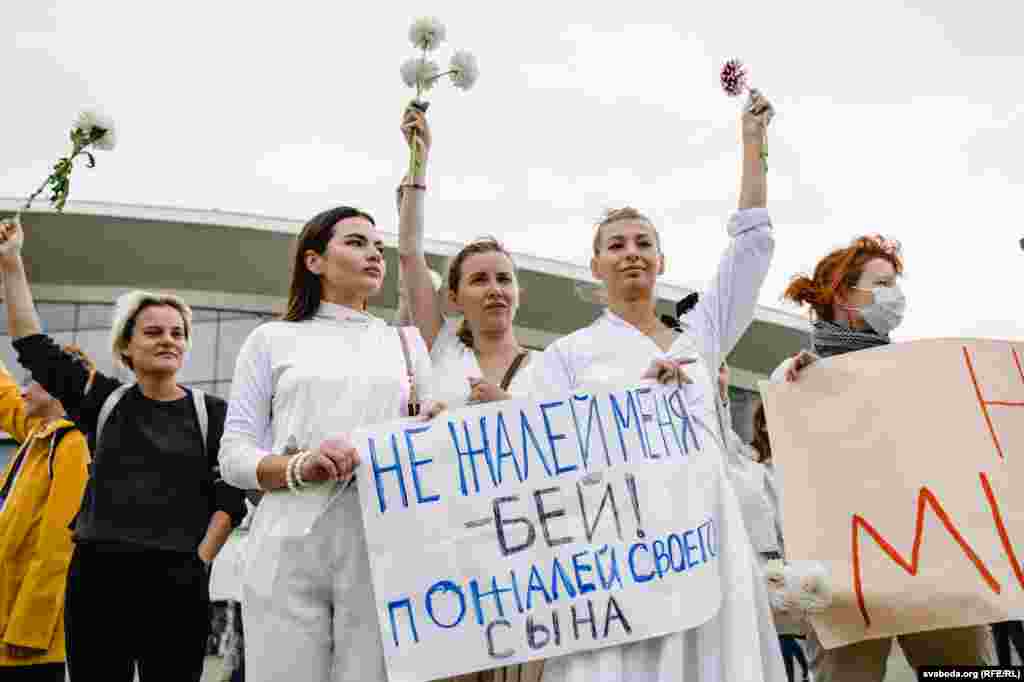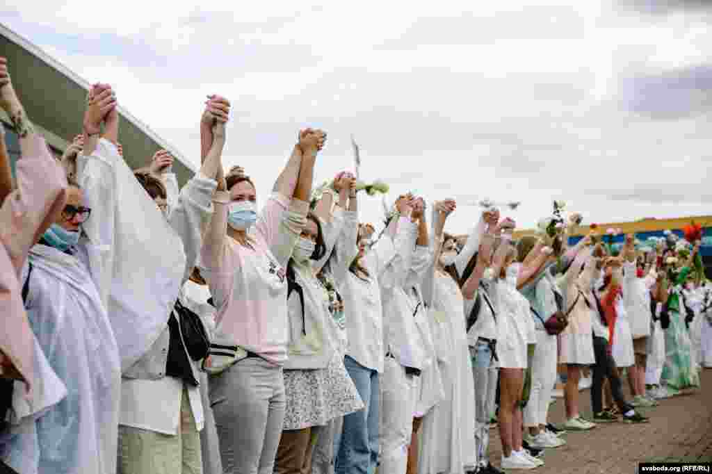 У Мінську кілька сотень жінок у білому одязі і з квітами в руках вишикувалися в ланцюг на знак солідарності проти насильства під час протестів у Білорусі, повідомляє Радіо Свобода.