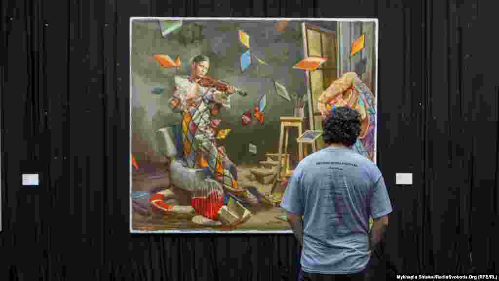 Робота «Сновида» виставлена на фоні невідремонтованих стін, які поміщають картини в певний контекст