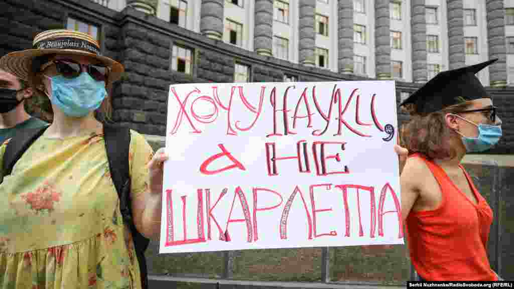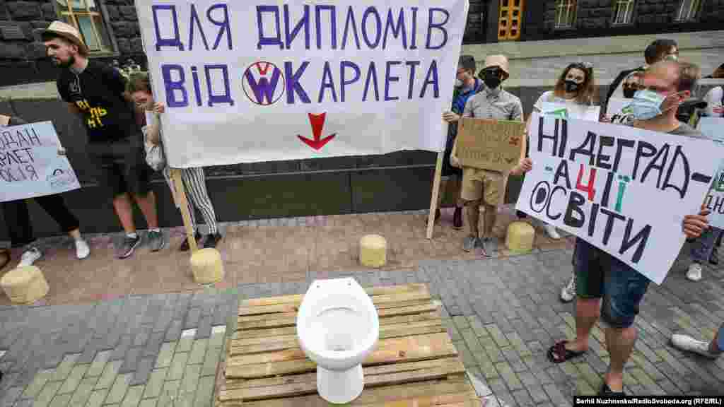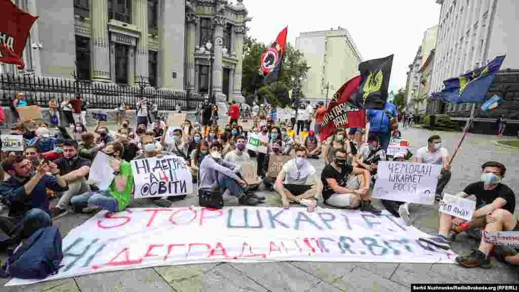 Кілька сотень людей протестували під будівлею Кабінету міністрів та Офісом президента у Києві через призначення ректора Чернігівського національного технологічного університету Сергія Шкарлета виконувачем обов’язків міністра освіти і науки.