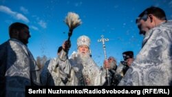 Патріарх Філарет освячує воду від час ранкової літургії з нагоди Богоявлення. Віряни УПЦ (КП) раніше, а нині ПЦУ традиційно збираються на лівому березі Дніпра біля каплиці Хрещення Господнього. Після літургії усі бажаючі занурються у крижану воду Дніпра.