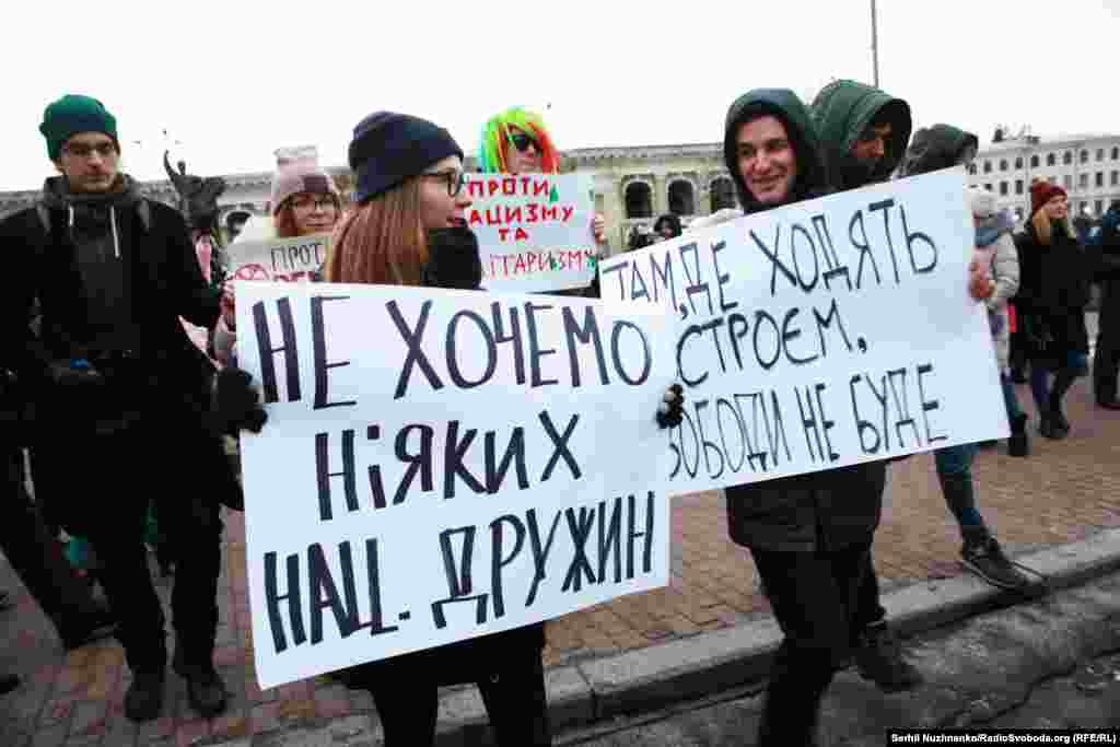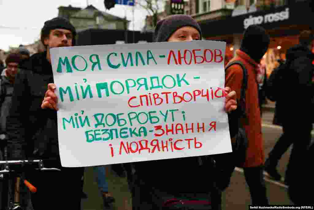 Учасники акції пройшли маршем від Контрактової площі до Поштової із гаслами «Ні насильству!», «Національній дружині – незачьот» тощо.