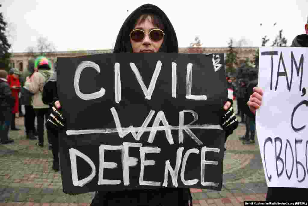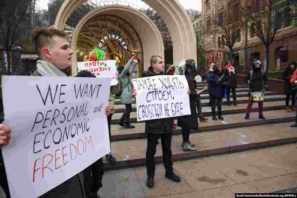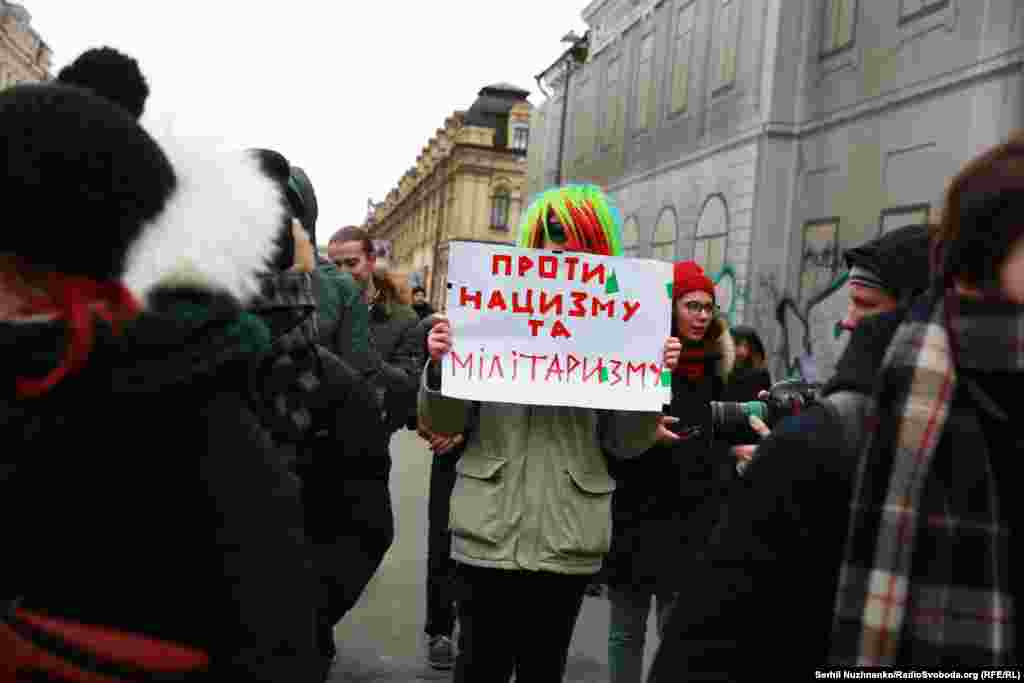 На Контрактовій площі у Києві зібралися кілька десятків активістів, щоб привернути увагу до мілітарних формувань, зокрема, мова йде про організацію «Національні дружини».