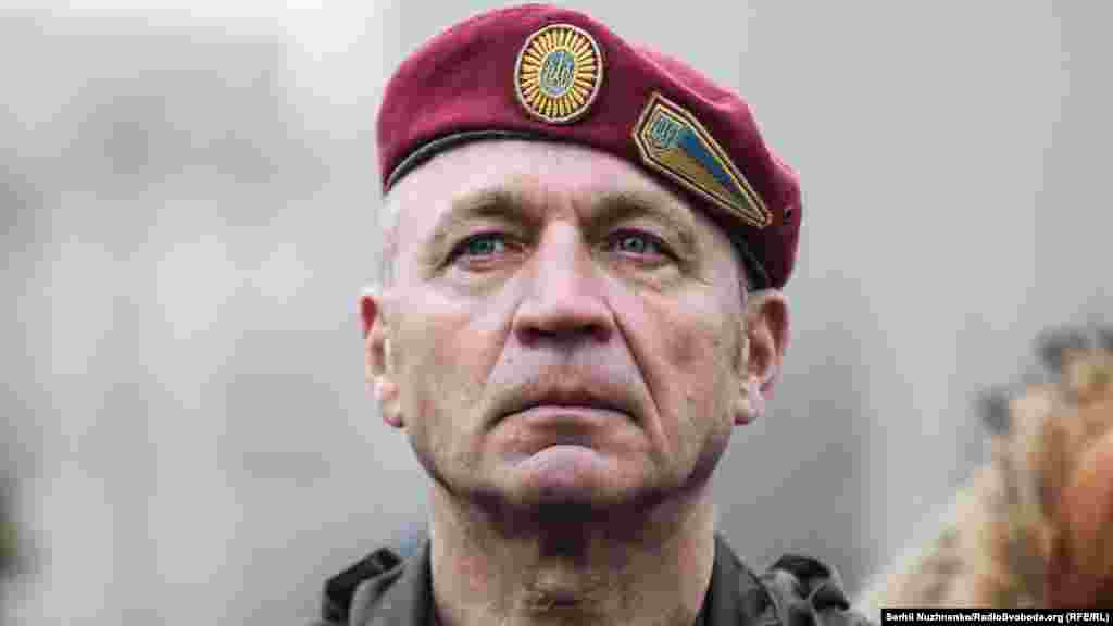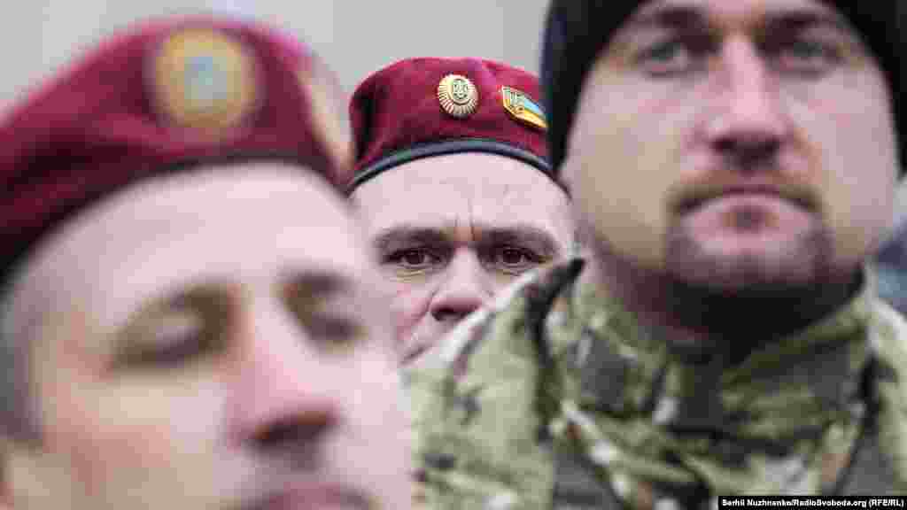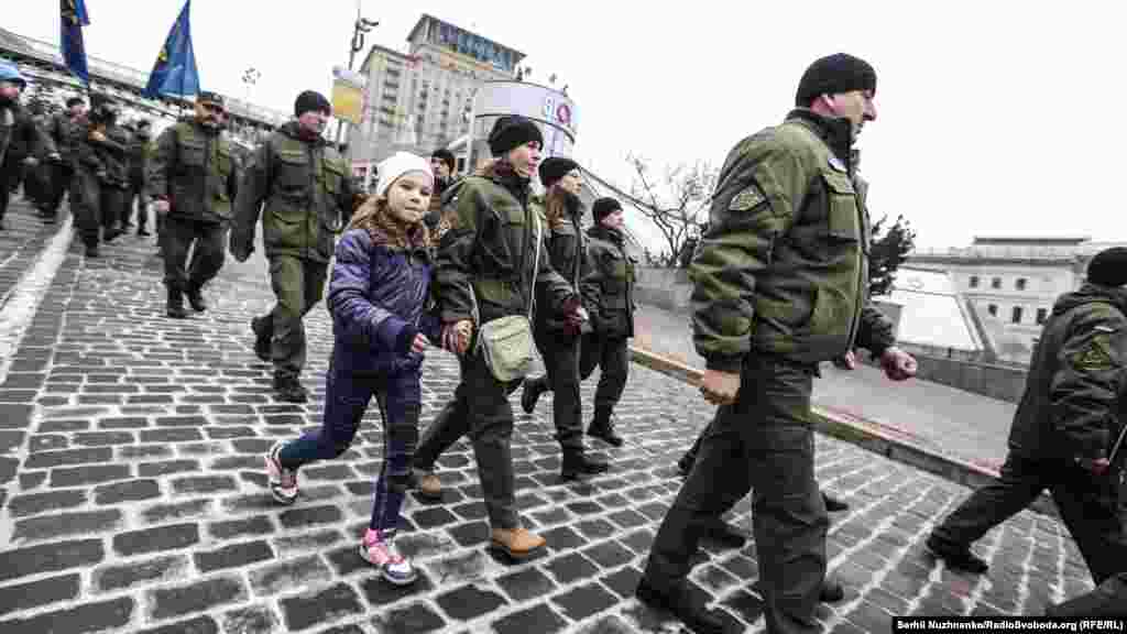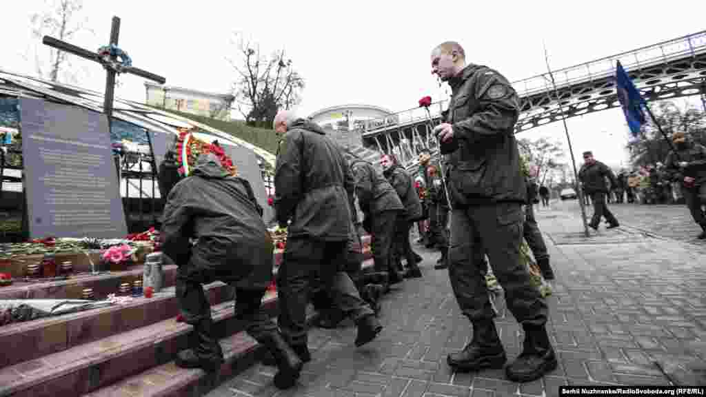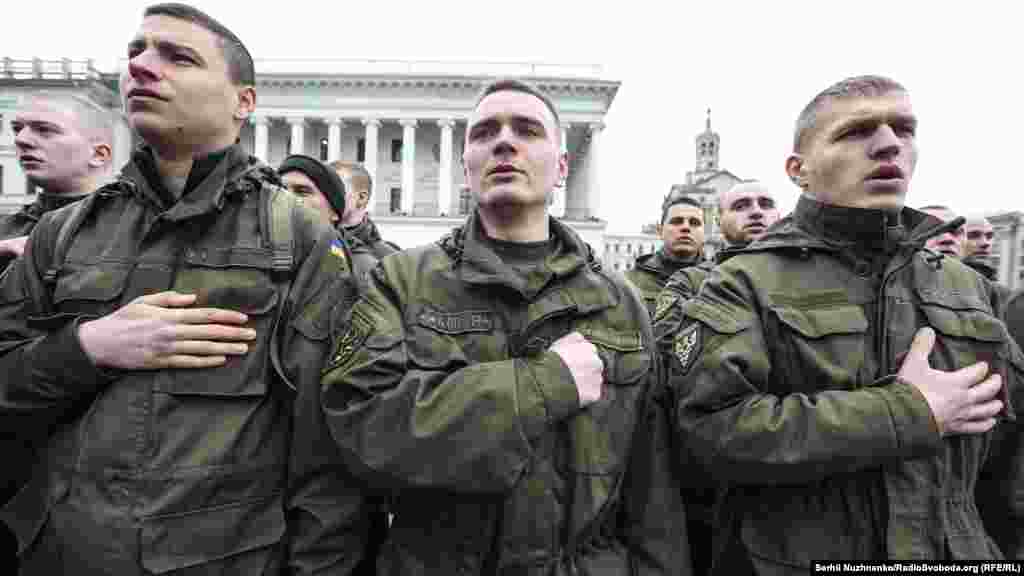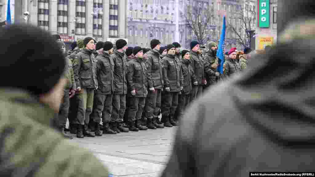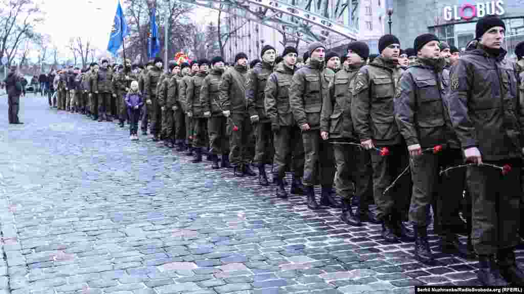 На майдані Незалежності відбулось урочисте шикування батальйону Нацгвардії України імені генерала Кульчицького. Перед тим бійці на алеї Небесної сотні вшанували пам'ять загиблих героїв Небесної Сотні, поклавши квіти до меморіалу.
