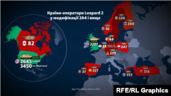 Донбас Реалії, за даними The Military Balance, підрахували кількість Leopard у країн-операторів, починаючи з версії 2А4 як наймасовішої і яку, як і 2А6, точно отримає Україна. У цьому списку немає Австрії і Угорщини, які офіційно відмовилися постачати озброєння Україні. «На папері» найбільші можливості допомогти Україні танками у Німеччини, Іспанії і Польщі. У Греції і Туреччини по три сотні Leopard, але перші постачати їх ЗСУ відмовились, а другі назвали такий крок «ризикованим».