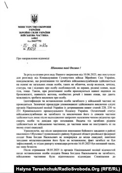 Виконуючий обов’язки командира військової частини А4862, де служив Богдан Вовк, Віктор Ільченко відповів на запит Радіо Свобода: