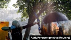 Мітингувальники відповіли «коктейлями Молотова», використовуючи для цього, зокрема, саморобні катапульти. За інформацією місцевої поліції, одного з поліцейських поранили в ногу стрілою з лука.