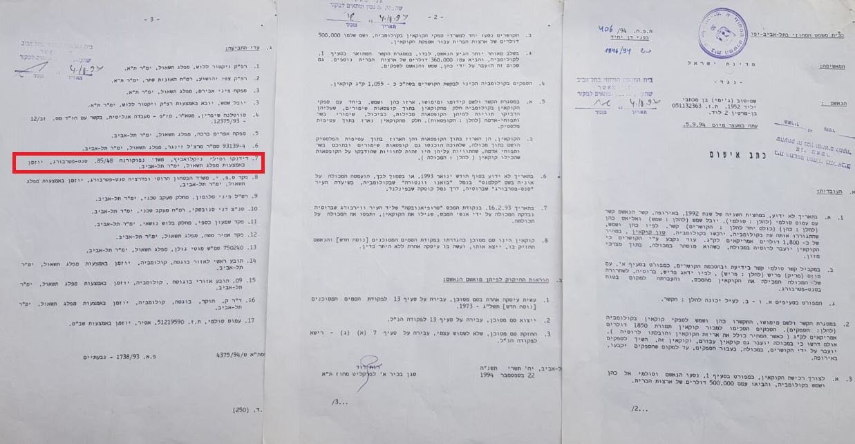Шемтов Міхтаві, як каже він сам, і як випливає з протоколу його допиту ізраїльською поліцією, з яким ознайомилися Радіо Свобода і телеканал «Настоящее время», він особисто возив супровідні документи на контейнер із Нідерландів до Колумбії та назад. Щоб його не піймали, ховав папери в підкладці портфеля. За його словами, замовником і одержувачем вантажу в Росії була вказана «мерія Санкт-Петербурга» (це частково підтверджують і документи ізраїльської прокуратури, які ми покажемо нижче), а між Анатолієм Собчаком, який буцім-то знав про постачання, та ізраїльтянами було двоє посередників.