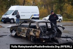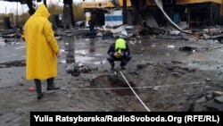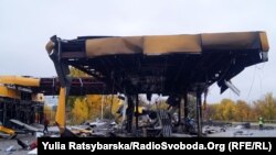 Уламки будівлі й обладнання АЗС, кілька згорілих майже вщент автівок, побиті фури, вирва. Так виглядає місце, куди впали осколки ракети на ранок 26 жовтня.