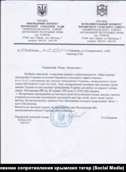 Коли Халілов каже про документи, то має на увазі заяву до голови Перовської сільради Корнєєва, яку він після зникнення соратника розмістив у фейсбук-групі «Движение сопротивления крымских татар», у якій Аметов просить внести в його паспорт відомості про належність до кримськотатарської національності. У випадку відмови він обіцяє анулювати громадянство України.