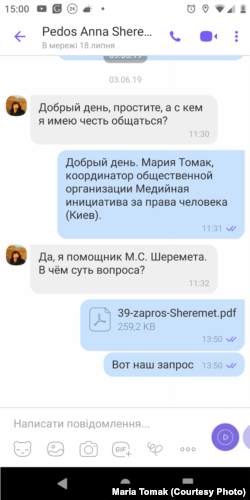 Ми звернулися із запитом до Михайла Шеремета (який в Україні перебуває в розшуку) щодо того, чи відомо йому щось про обставини зникнення Решата Аметова і про причетність до цього підконтрольних йому збройних формувань. Після надісланого у фейсбуці запиту (інших офіційних контактів знайти спершу не вдалося) відповіді не отримали. Далі ми звернулися до його помічників – одна з адресатів Анна Педос підтвердила, що є помічницею Шеремета, але відповіді на запит не надала.