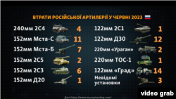 Згідно з даними проєкту Oryx, який підраховує втрати техніки за фото та відео, з початку червня ЗСУ знищили, часом – пошкодили, понад 60 одиниць польової та реактивної артилерії армії РФ. Це близько 7% від усіх артилерійських установок, які втратила Росія.