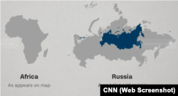 Африка насправді десь в три рази більша за Канаду, хоча на картах Канада більша. Африка також в півтора-два рази більша за Росію, а на картах Росія – ого-го яка велика і значно більша за Африку!