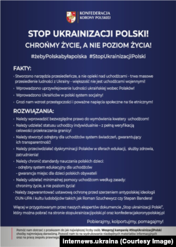 Зокрема, існують групи й сторінки з назвою «Stop Ukrainizacji Polski» (Стоп українізації Польщі). Там стверджують, що українці нібито мають більше прав і «крадуть гроші поляків», а ЄС «грабує Польщу».