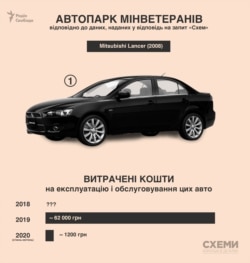 У Міністерстві у справах ветеранів журналістам також відповіли, що мають на балансі одну автівку – це Mitsubishi Lancer 2008 року випуску, який вони отримали в 2019-му як правонаступники ліквідованої Держслужби в справах ветеранів війни та учасників АТО. Торік міністерство витратило на його утримання близько 62 тисяч гривень, а за перші місяці 2020-го – ще близько 1700 гривень.