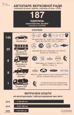 Відповідно до отриманих журналістами даних, майже дві сотні автівок нараховує автопарк Верховної Ради України – станом на 1 травня 2020 року їх налічувалося 187. Більш ніж половина серед них – це легкові автівки: Mercedes, Toyota, Volkswagen, Škoda тощо. Хоча, крім них, на балансі в автобазі Верховної Ради є автобуси, вантажівки і навіть спецмашини для перевезення пального й прибирання тротуарів.