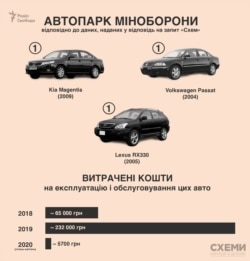 Дещо менше – три службові авто – стоять на обліку в Міністерства оборони: седани Kia й Volkswagen і позашляховик Lexus, які були випущені в 2004–2009 роках. Примітно, що на їхнє обслуговування в 2018-му міністерство витратило 65 тисяч гривень, тоді як у 2019-му майже вчетверо більше – 232 тисячі гривень. А їхнє утримання протягом січня-квітня 2020-го вже коштувало близько 6 тисяч гривень.