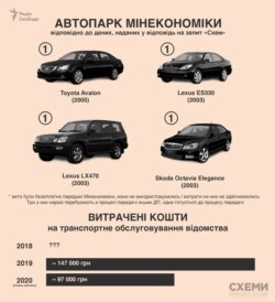 Чотири автівки перебуває на балансі Міністерства економіки станом на початок травня – три седани й один позашляховик, усі 2003–2005 років випуску. Але, як вказало відомство у відповіді «Схемам», ці машини були безоплатно передані їм від дочірньої компанії «Нафтогазу» – «Газ України» – і в Мінекономіки вони не використовувались і витрати на них не здійснювались. Крім того, три зі згаданих автівок вже перебувають в процесі передачі від міністерства на баланс ДП «Міжнародний дитячий центр «Артек», а ще одне – готується до передачі держпідприємству «Укрхімтрансаміак».