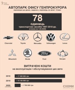 У відомстві не стали вказувати кількість машин конкретних марок на балансі – лише зазначили перелік марок і період, у який усі вони були випущені. Таким чином, в автопарку Офісу генпрокурора є Mercedes-Benz, Lexus, Toyota, Volkswagen, Mitsubishi, Chevrolet, Ford і «Богдан», які були випущені протягом 1997–2018 років.