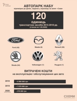 Автопарк Національного антикорупційного бюро станом на цей час складається зі 120 машин. У відомстві не уточнювали конкретні моделі автівок, але зазначили роки випуску. Виявилось, що на балансі бюро – найновіші автівки серед правоохоронних відомств, які надали журналістам дані про це. Усі вони були випущені в 2015–2018 роках.