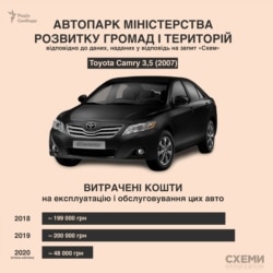 У Міністерстві інфраструктури також повідомили «Схемам», що не мають на балансі службових автівок – та водночас зазначили, що за договорами з держпідприємством «Укрсервіс Мінтрансу» про транспортне обслуговування відомство користувалося Toyota Avalon 2008 року випуску. І за це міністерством було сплачено 429 тисяч гривень у 2018-му, 199 тисяч гривень у 2019-му і ще 199 тисяч гривень у 2020-му.