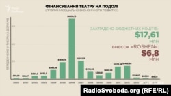 Табличка на стіні Театру на Подолі урочисто повідомляє, що будівлю реконструйовано та обладнано коштом компанії «Рошен». За даними компанії, це 174 мільйони гривень або, за курсом на час фінансування, 6,8 мільйона доларів. Тут могла б бути ще одна табличка, в якій ішлося б про 17 мільйонів зібраних із киян податків, але про це вирішили не повідомляти.