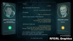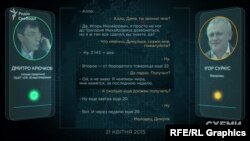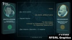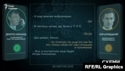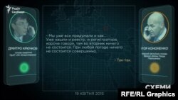 «Схемам» вдалося отримати записи телефонних розмов бізнесмена Дмитра Крючкова, завдяки яким можна почути відповіді на ці питання. Події охоплюють період весни-літа 2015 року, коли остаточно формується вертикаль влади після революційних подій – а різні напрямки закріплюються за конкретними кураторами та виконавцями. Експертиза довела високу вірогідність, що голоси співрозмовників є справжніми.