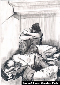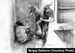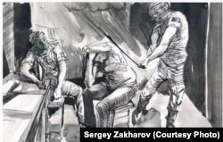 Малюнки Захарова – це нескінченна низка замучених людей, які в основному лежать на підлозі камер, у коридорах і кабінетах із письмовими столами, яких б’ють озброєні люди у військовій формі. На них не завжди можна розібрати розпізнавчі знаки, і якщо не знати, що мова йде про те, що відбувалося в Донецьку в 2014 році, можна уявити будь-яку в’язницю в тих країнах, де тортури стали частиною повсякдення.