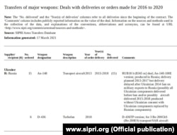 Зокрема, у випадку з експортом озброєнь із України до Росії інститут зараховує до цього також і озброєння, вироблені в Росії за узгодженою ліцензією. За період 2016–2020 років це стосується тільки дев’яти літаків Ан-148. Крім того, є відкрите замовлення на шість турбореактивних двигунів Д-436 для трьох літаків Бе-200ЧС російської розробки.