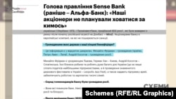 «У разі рішення уряду чи Національного банку щодо необхідності передачі контролю над банком державі чи іншому акціонеру власники істотної участі готові безоплатно передати його акції», – йдеться у відповіді «Сенс банку» на запит «Схем».