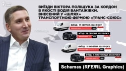І справді, 17 серпня 2023 року Віктор Поліщук перетнув кордон у напрямку Польщі за кермом вантажного буса Mercedes Sprinter. Разом з ним була і його дружина. Про це свідчать дані про перетин кордону із прикордонної служби, які є в розпорядженні «Схем».