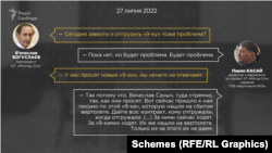 Далі – розмова датована 27 липня 2022 року. Богуслаєв в кабінеті говорить із Павлом Касаєм, директором з маркетингу та торгівлі «Мотор Січі» та керівником дочірньої компанії цієї корпорації «Вертольоти МСБ».